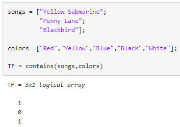 색 이름이 들어간 노래를 나열하려면 논리형 TF 배열을 원래 songs 배열에 대한 인덱스로 사용하십시오.