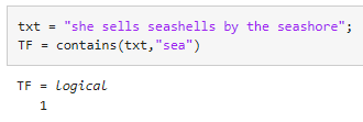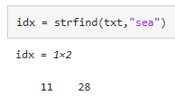 텍스트가 나타나는 위치를 찾으려면 시작 인덱스를 반환하는 strfind 함수를 사용하십시오.