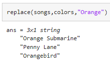 함수 replace를 사용하여 songs에서 colors의 요소와 일치하는 텍스트를 문자열 "Orange"로 바꿉니다.