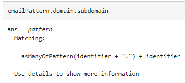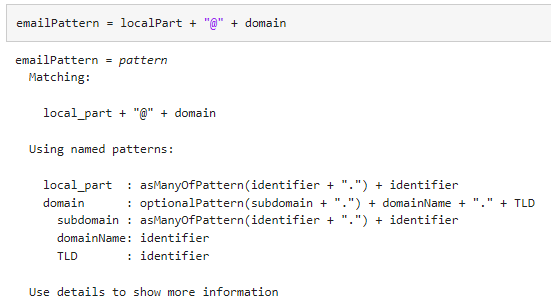 emailPattern 표시에서 각 명명된 패턴, 패턴이 일치하는 항목과 더불어 중첩된 명명된 패턴에 대한 정보를