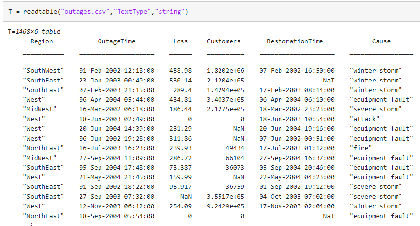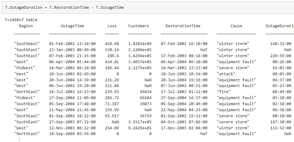 하지만 readtable은 계속해서 OutageTime 및 RestorationTime을 datetime형 배열을 저장하는
